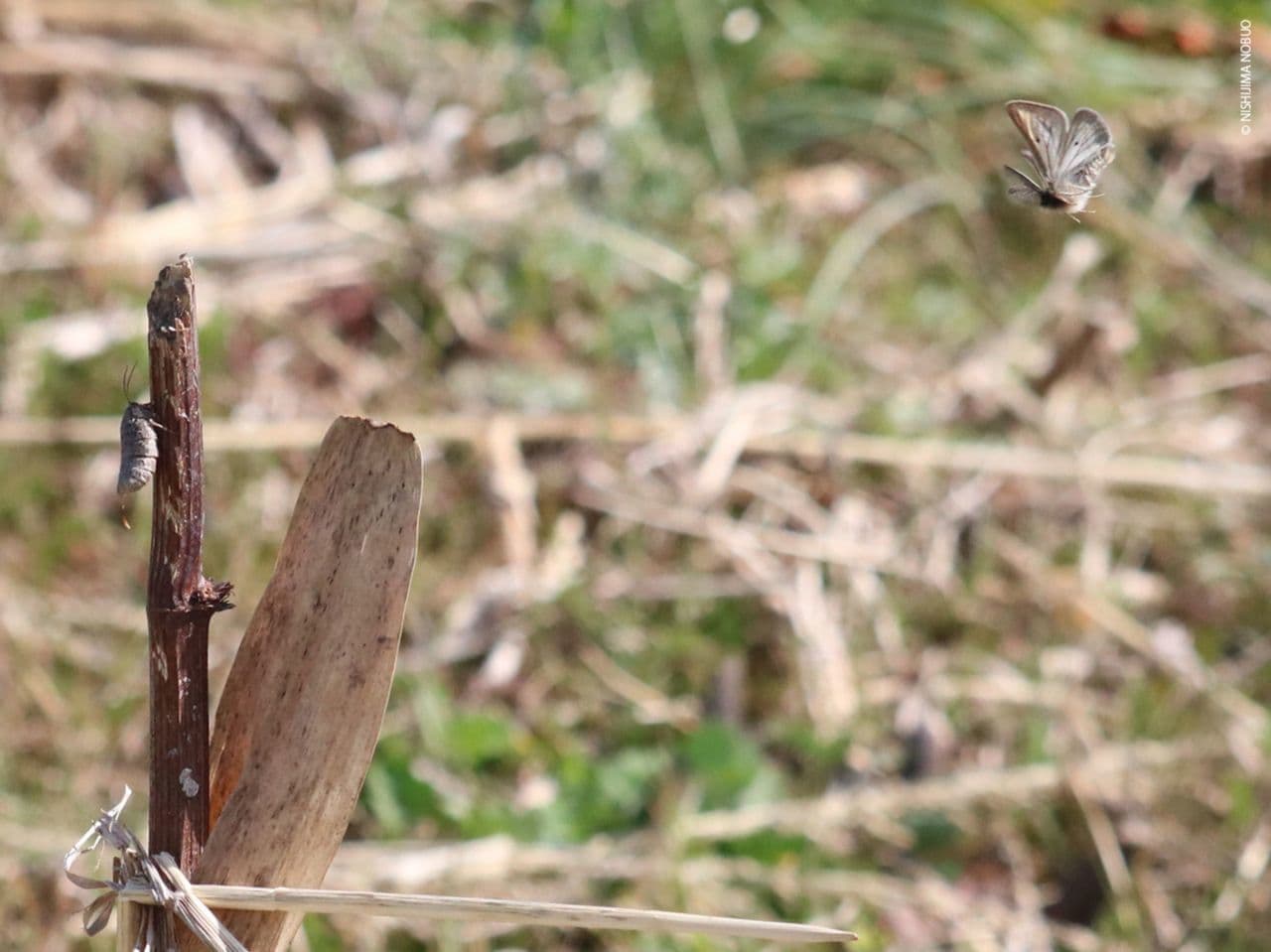 フユシャク人気種(埼玉県レッドデータブック2018準絶滅危惧1型)で、尾端フェロモン腺が伸びた飼育処女雌をめがけて野生雄が上空から飛来するシーンを捉えました。