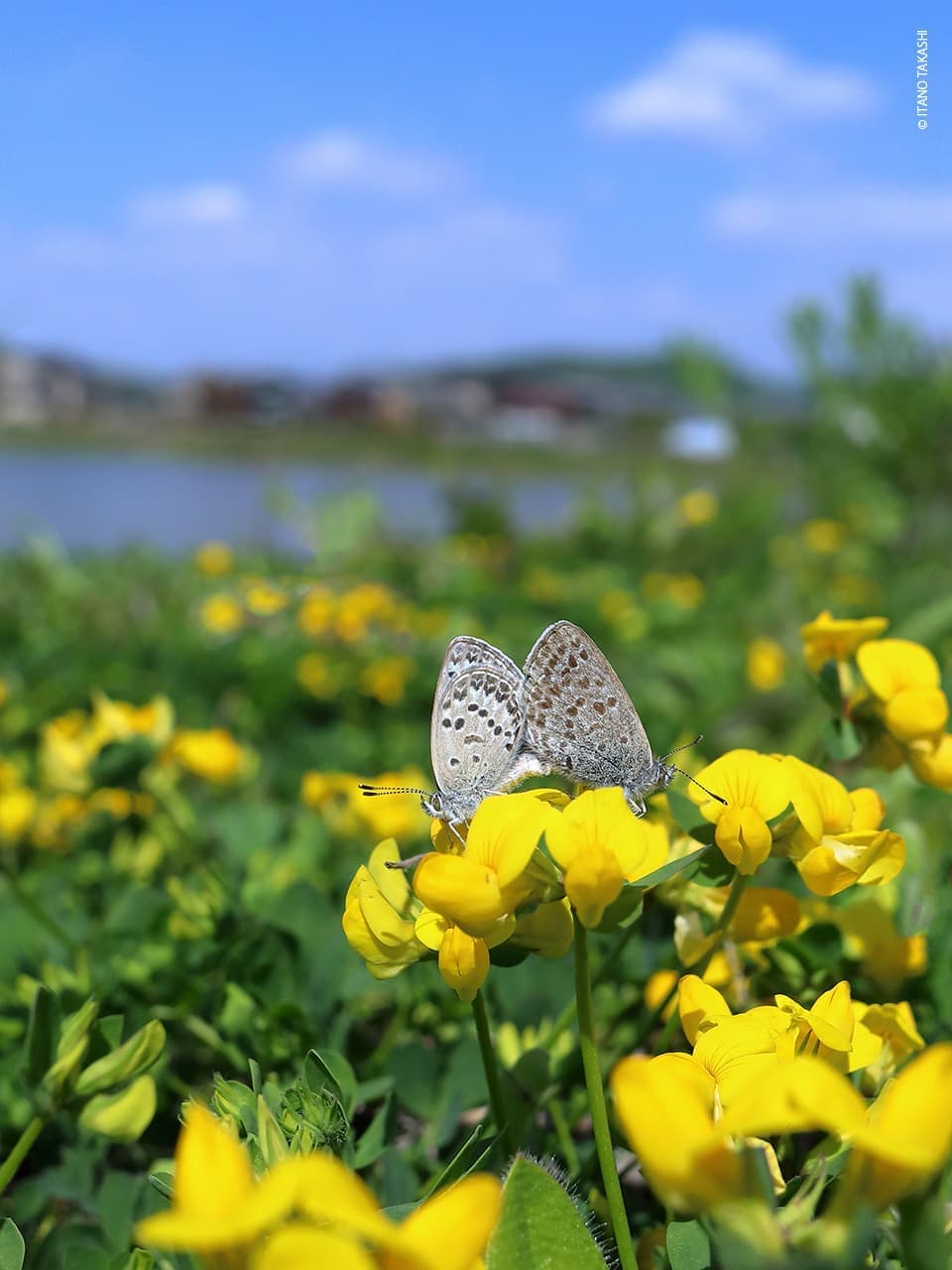 当地では定期的に草刈りが行われる溜池が点在します。このような人の営みによって維持される環境でシルビアシジミは細々と命を繋いでいます。4月下旬、ミヤコグサの開花期に合わせてシルビアシジミの第1化が発生し、運が良ければこのような光景にも出会うことができます。