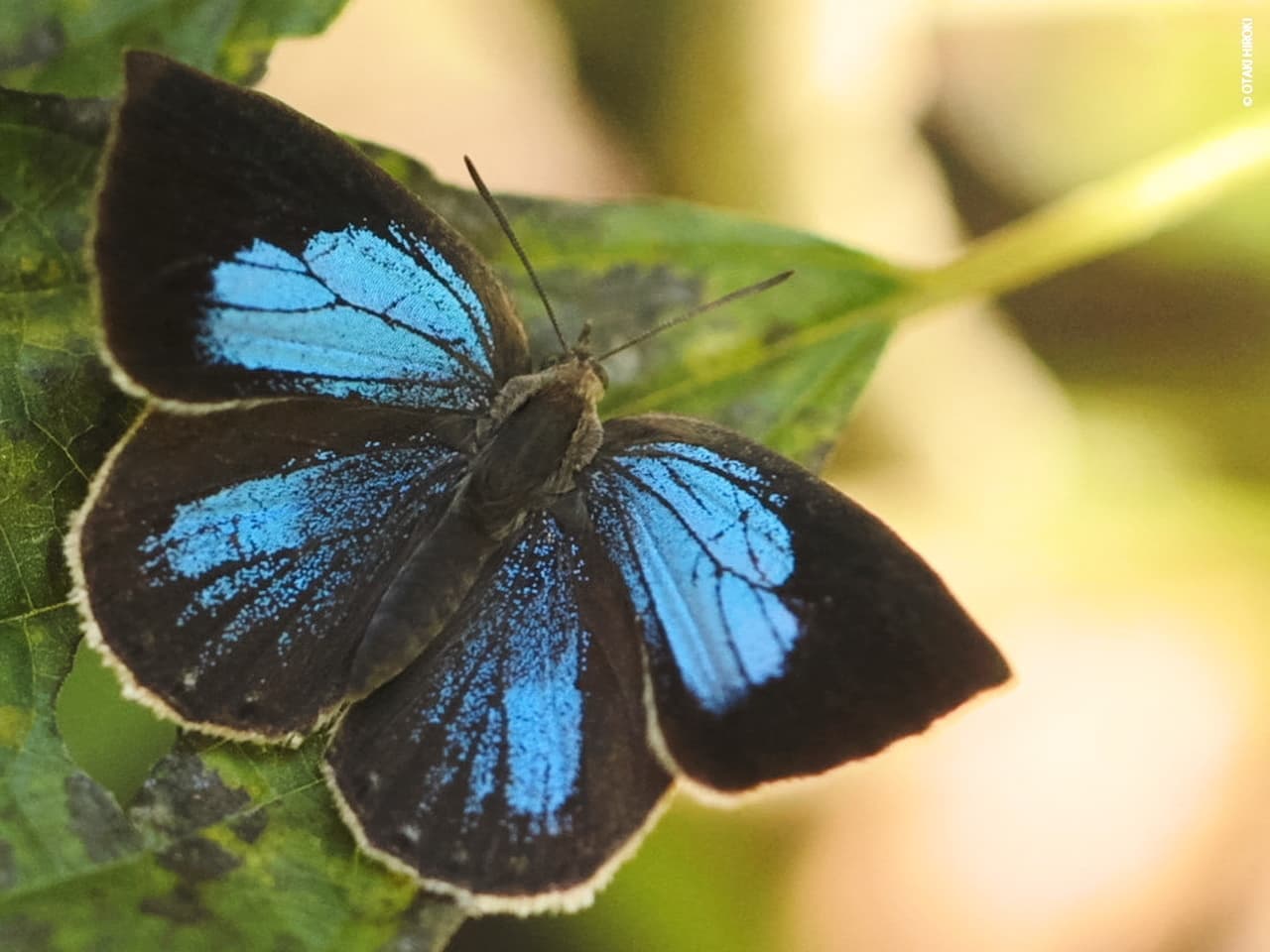 東日本では房総半島でしか出会えない、生息地が限られた小さなシジミチョウです。まるでトトロが出てきそうな薄暗い森に木漏れ日が差し込むと、ゆっくりと翅を広げ、鮮やかなブルーが見られます。翅があたたまると、やがてはるか樹上へと飛んでいきました。