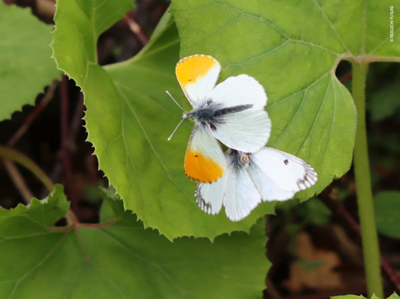 フキの葉で休憩中のメスに、オスがメスの周囲を回りながらな求愛行動。しかしメスは腹部を上げ拒否行動。その行動を少々興奮気味に20秒程カメラを連写し撮影した1枚です。