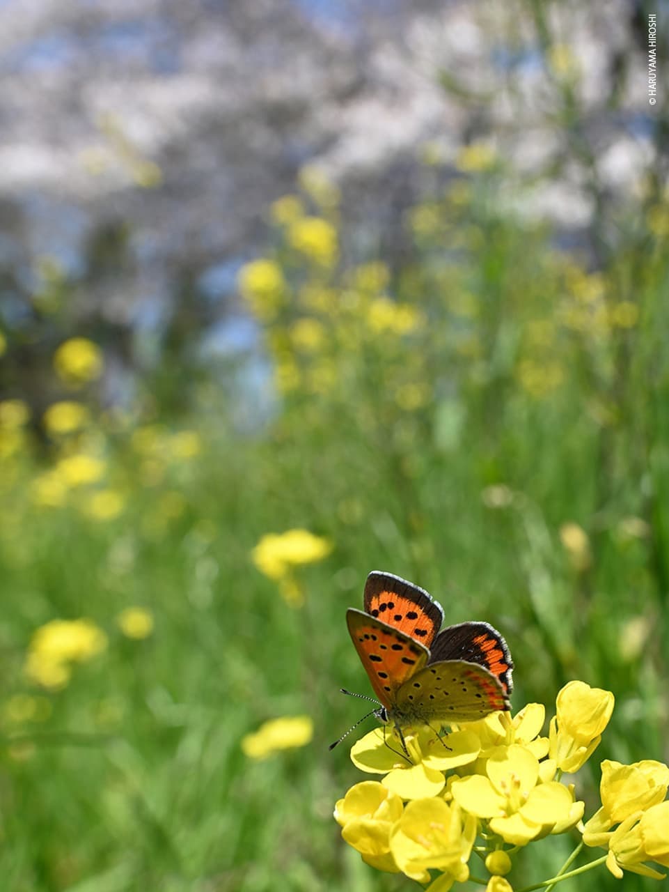 菜の花の咲く小川の土手でモンシロチョウを撮っていたら、ベニシジミが綺麗だったので、桜も入れて広角で狙いました。やっと撮れたのはこの写真です。