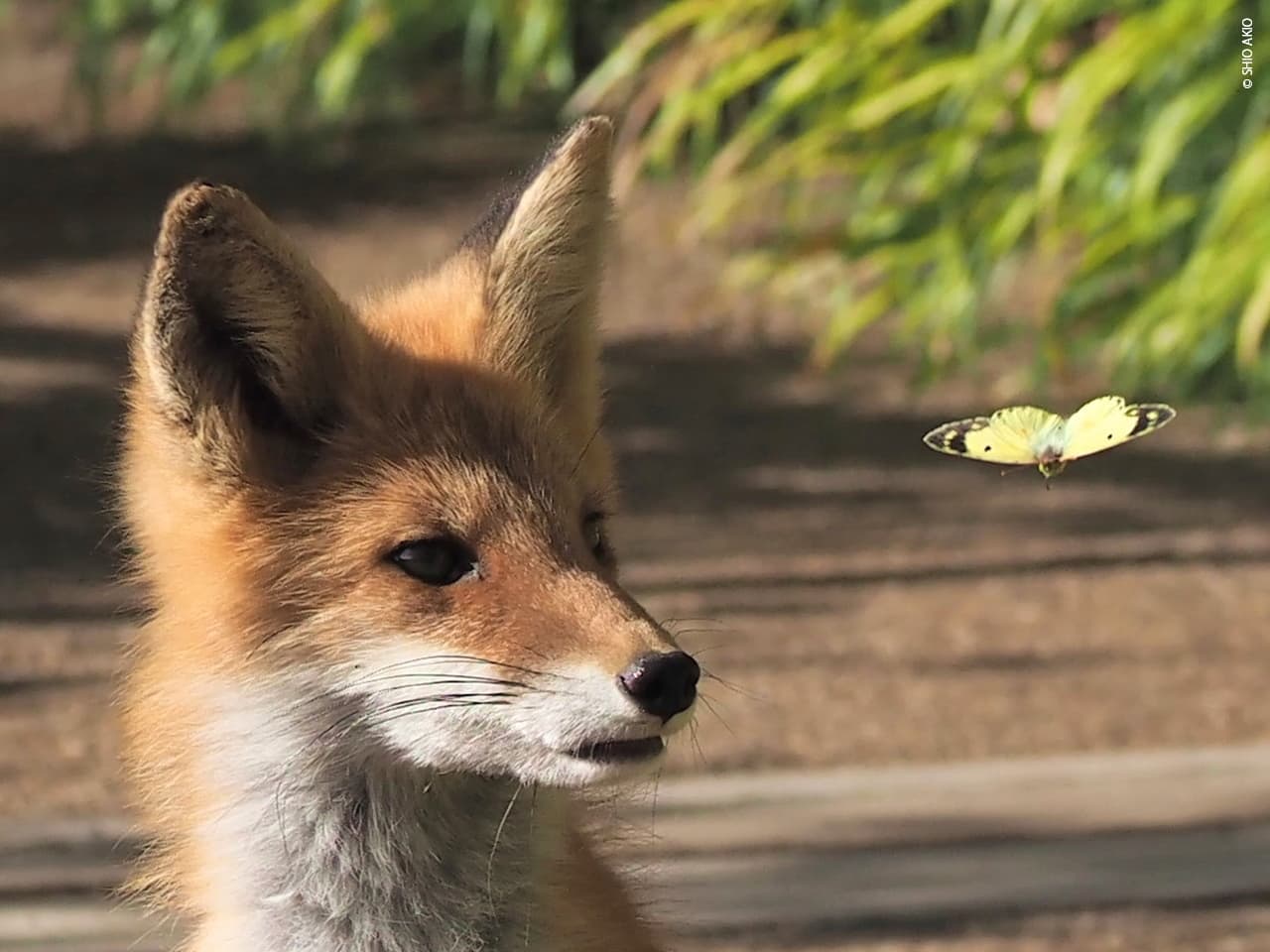 若いキタキツネを見つけて撮影中、モンキチョウが飛んできたらしい。実は撮影した記憶がない。たまたま撮れていた写真にビックリ。