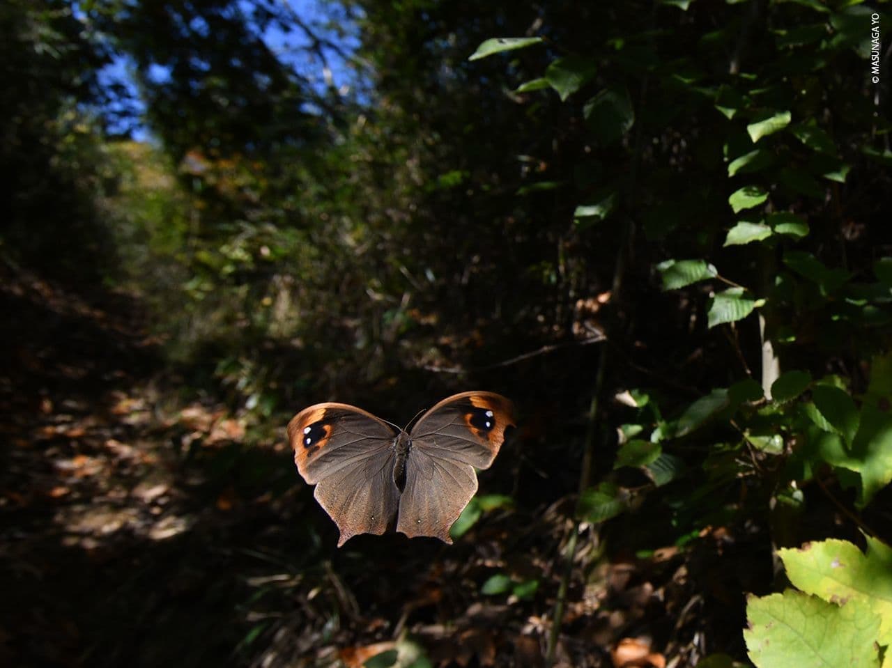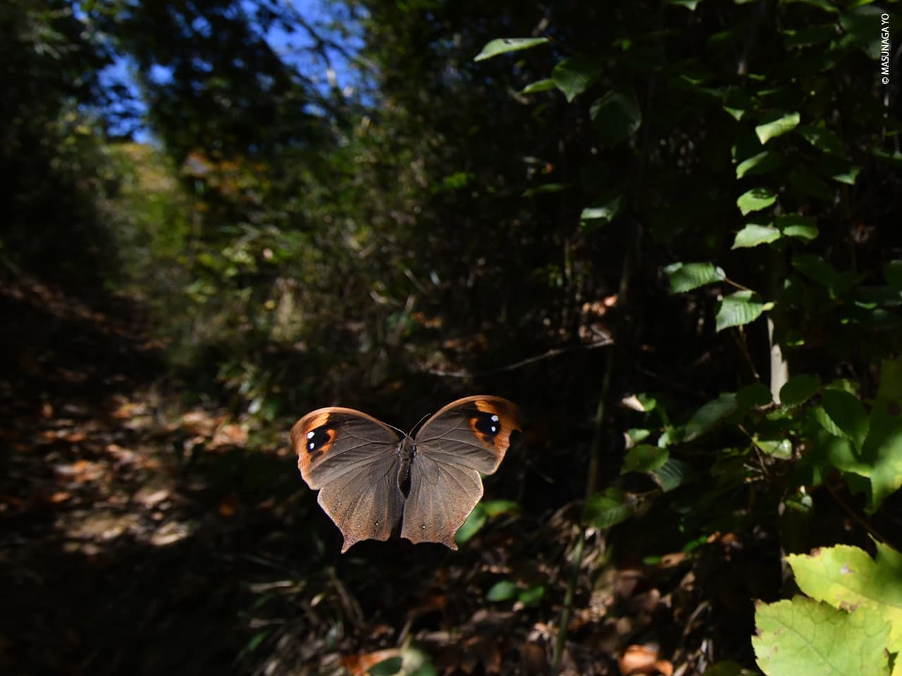 かつては南のチョウだったクロコノマチョウは今ではすっかり東京近郊の里山にも定着し身近な存在になった。晩秋の枯落ち葉に同化する茶系の横顔は地味だが、翅を広げると鮮やかな目玉模様が現れる個体が多い。人の気配に敏感で、なかなかその姿を撮らせてくれないチョウであるが、今回は珍しく飛び立つ瞬間を捉えることができた。