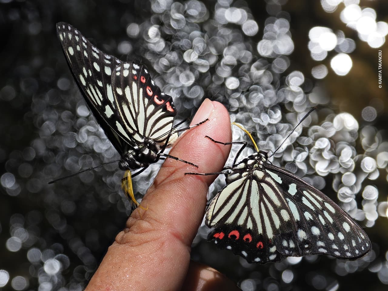 アカボシゴマダラを二頭を先ず指に止めた後、流れる小川にまで移動し、背景に水面に反射する光彩を入れて、深度合成により表現してみたものです。