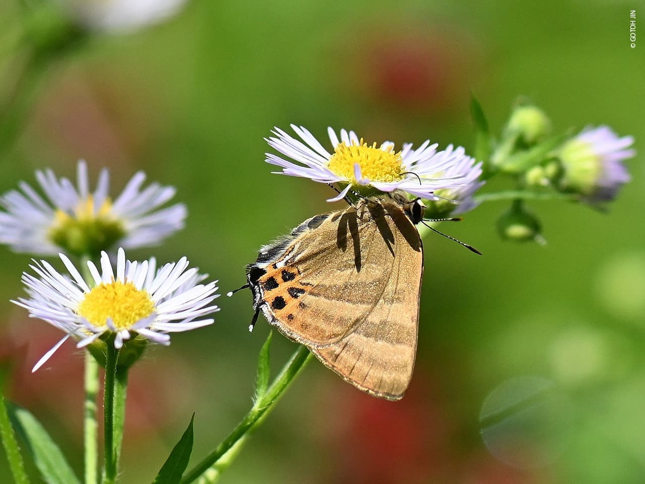 花粉がつくのがいやなのか、裏から蜜を吸うトラフシジミ