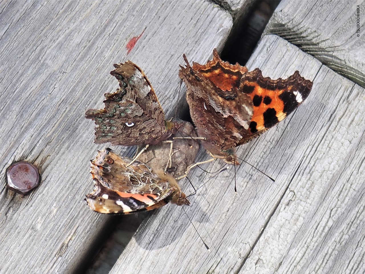 木道にあった「ご馳走(獣糞?)」に、タテハ4種が代わるがわる口吻を伸ばしていました。ずぅっと見ていると、キベリタテハ・エルタテハ&シータテハ・アカタテハの順に力関係があるようで、キベリに他の3種は遠慮がち(なので4種撮影はできず)、エルとシーはキベリを意識しながらもマイペース、様子を伺いながらじりじりと距離を詰めて、やっと「ご馳走」にありついたアカは、シーに足蹴にされても踏ん張っていました。落葉樹林や草地で越冬するタテハ達の裏翅は、「かくれんぼの達人」模様です。シータテハ裏翅の「コケ状斑」の緑色(=擬態の凄さ)まで撮れて嬉しかったです。