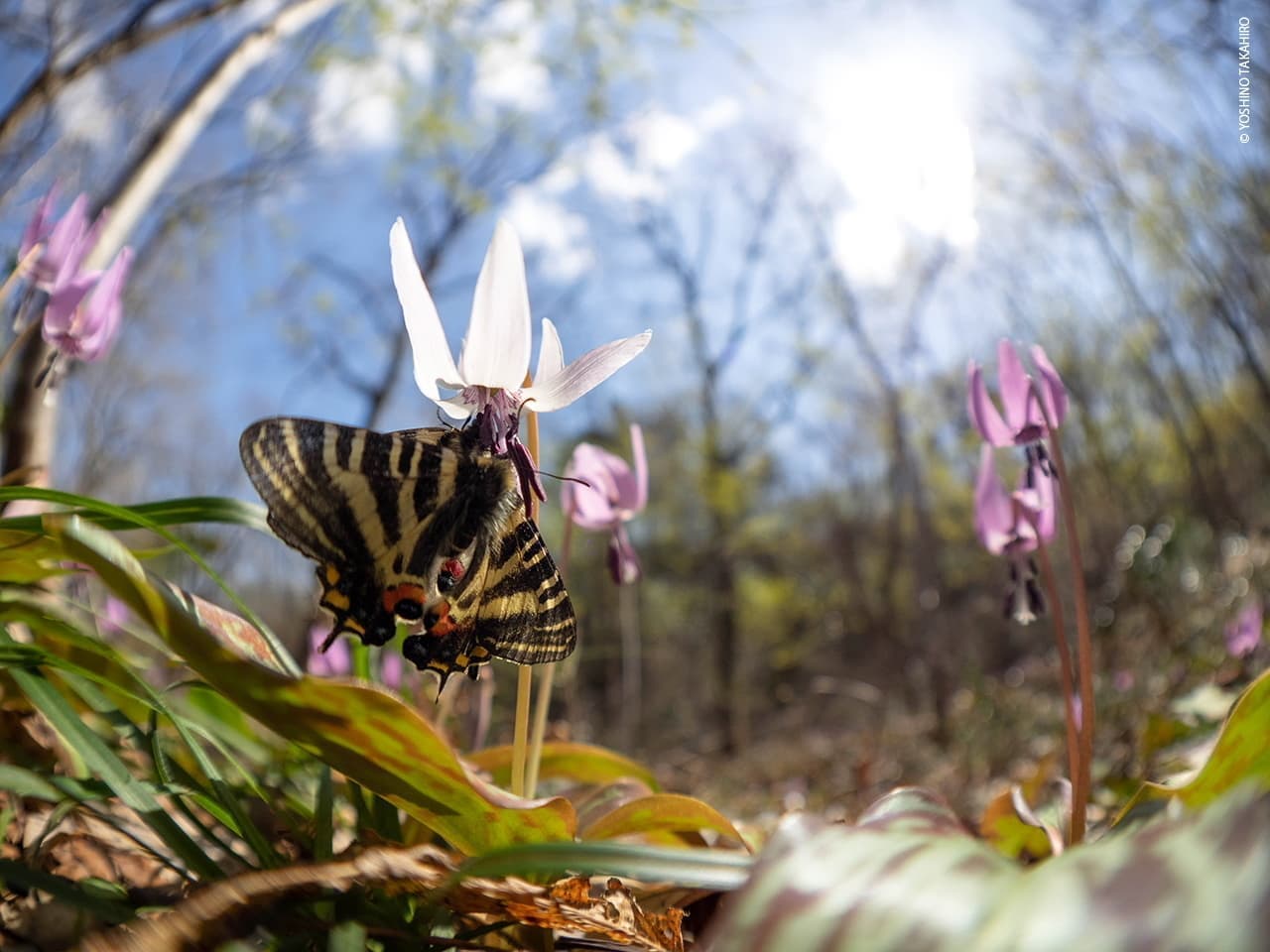 春の陽光が降り注ぐ新潟のカタクリ群落。たくさん咲いているカタクリの中、一本だけ咲いていた白いカタクリで交尾するギフチョウを撮影することできた。