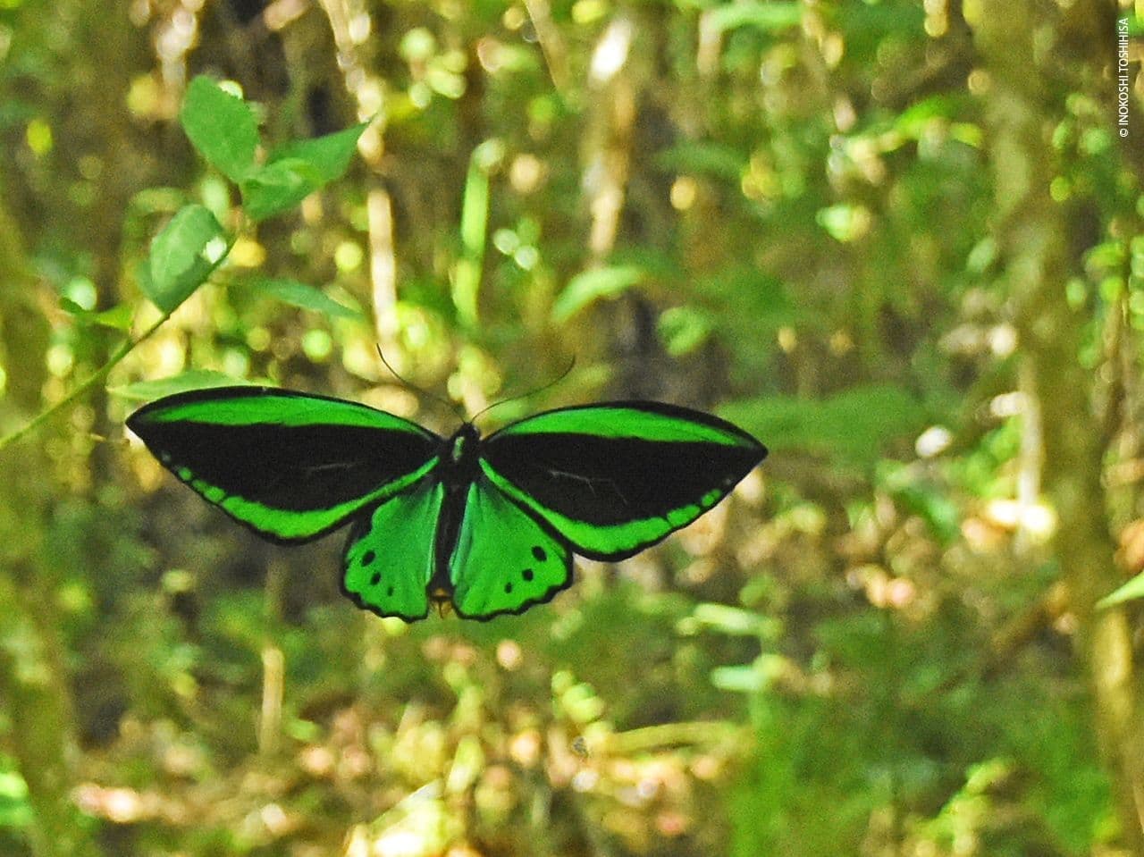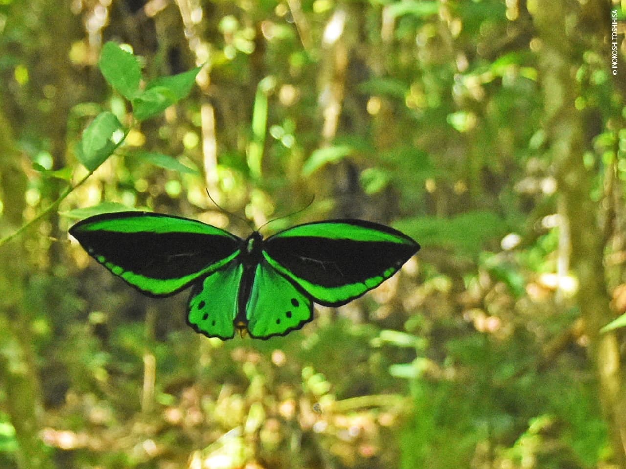 ニューギニア島西部のイリアンジャヤでは4種類のトリバネアゲハを見ましたが、他の3種は標高1,000m付近の丘陵部を悠然と翔んでいたのに対し、本種は海岸に近い、汗が吹き出るような蒸し暑い森の中を、「サングラス」を掛けた人面紋様で木々を縫いながら翔んでいたのが印象的でした。